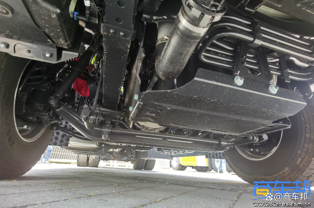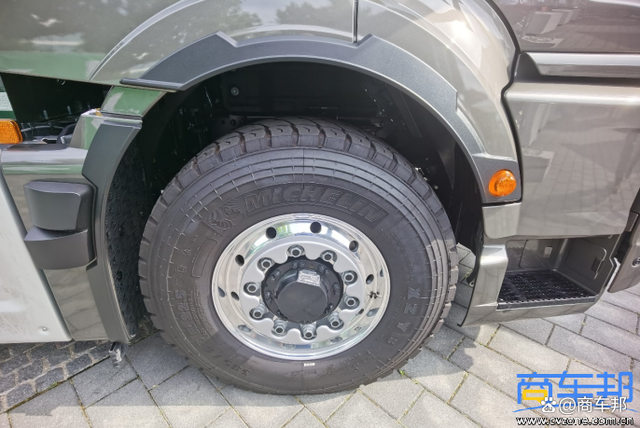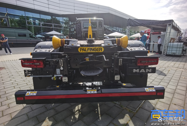 德國曼恩自裝卸式消防車采用德國曼恩TGS 26.470 6×2-4底盤 窄體平頂駕駛室,470馬力,驅動型式6×2-4,即第二橋驅動,第三橋為提升橋,可以反向轉向(有液壓缸驅動車輪轉向,不是隨動轉向),轉彎半徑更小。